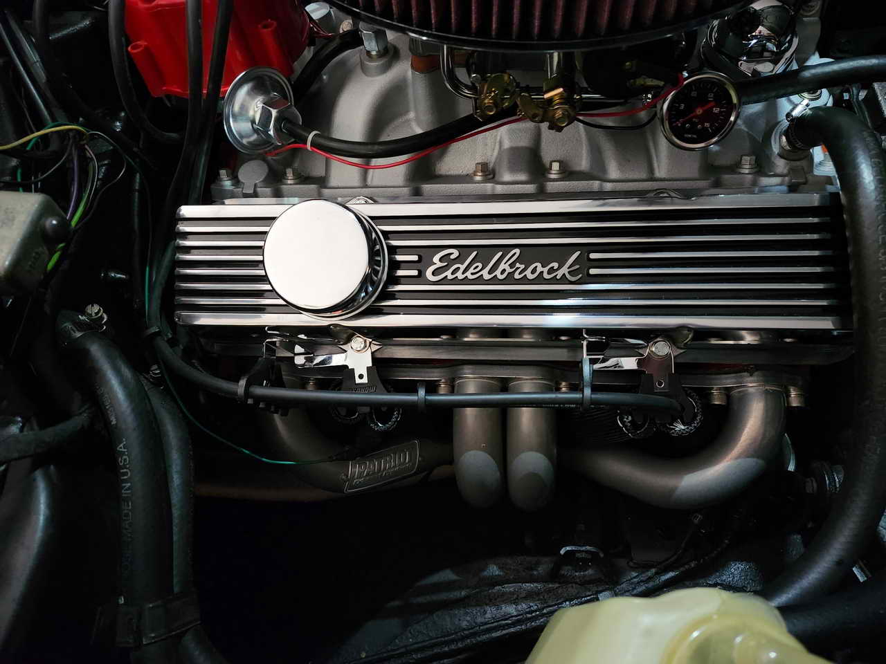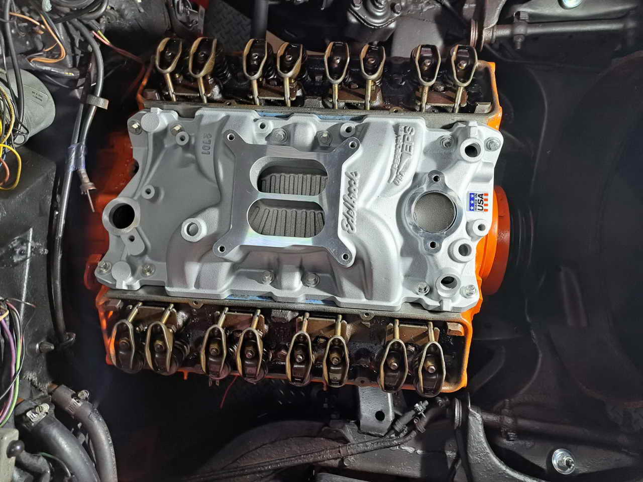Install Carburetor (Edelbrock Performer AVS 2) Edelbrock 8725 spacer, Air breather