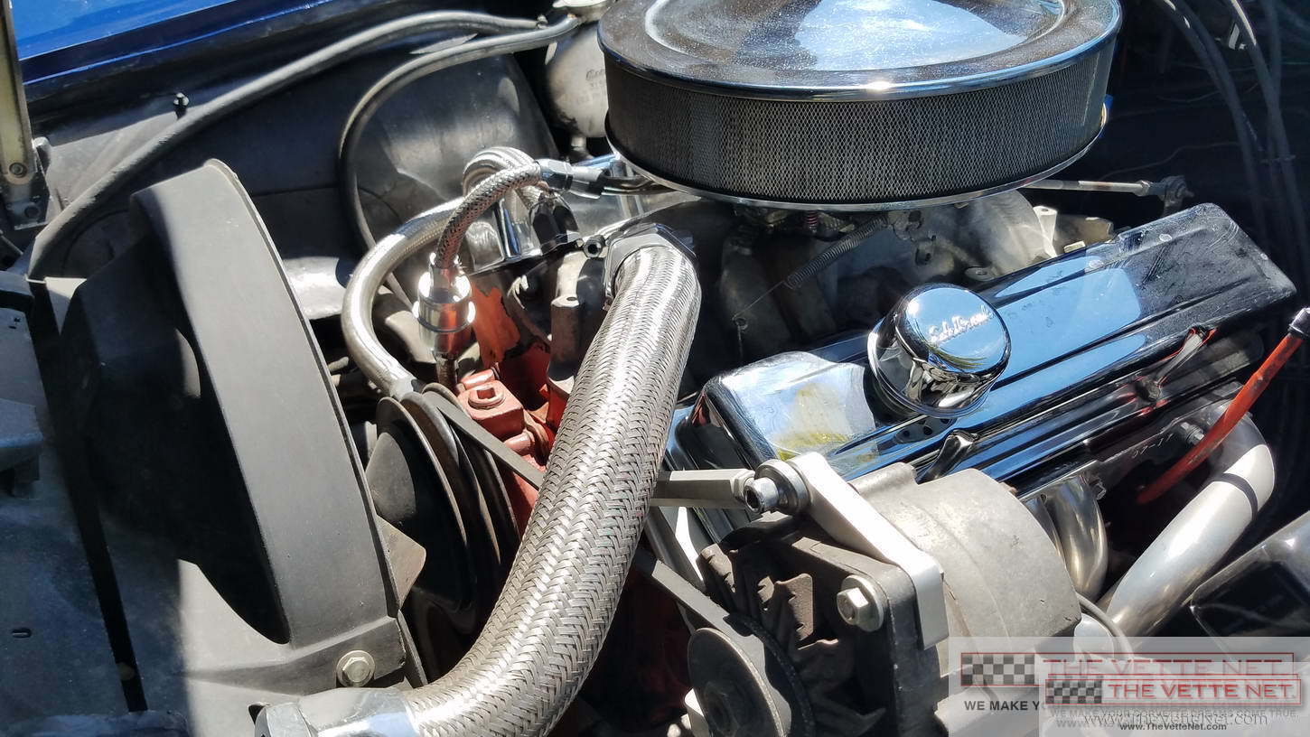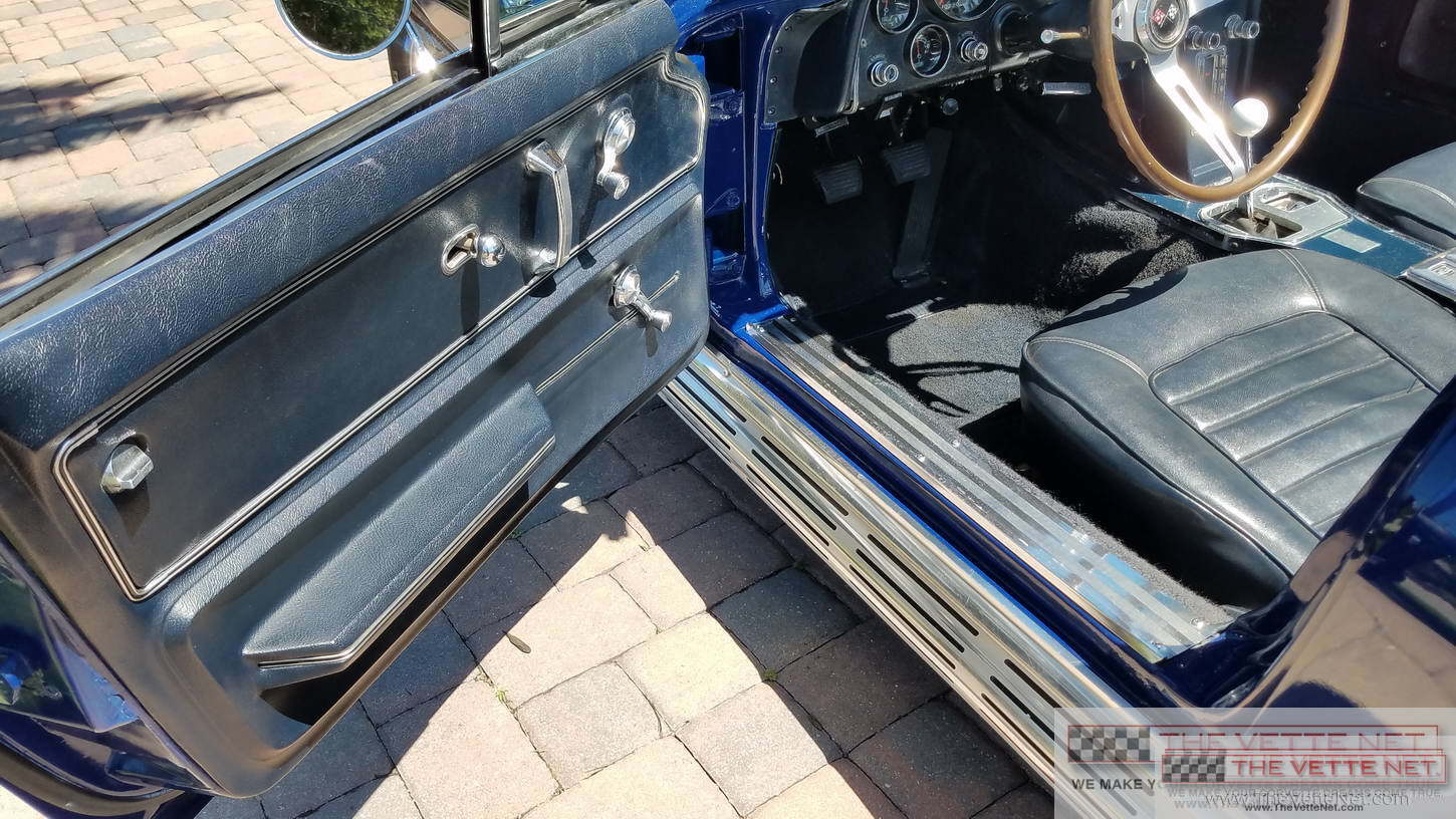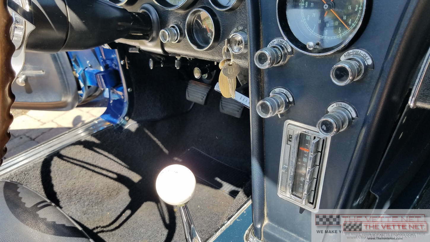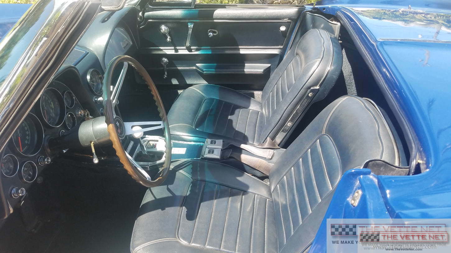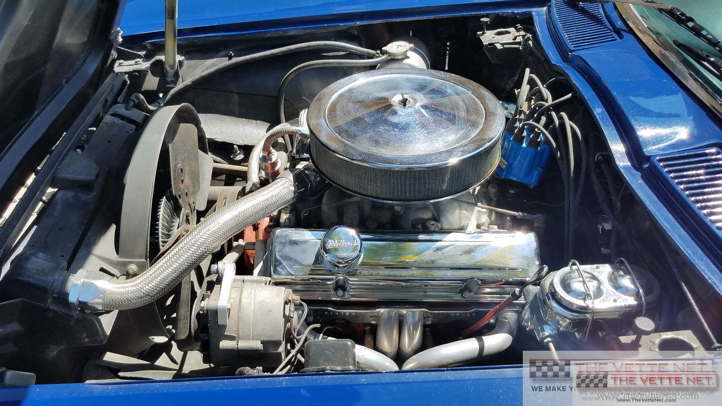 It is powered by a newer GM 350 engine which replaced the factory 327/350 L79 the car came with. There is no information on the HP rating, but it is believed to be around 300 with the help of the high-rise manifold and Flowmaster headers. Transmission is a 4-speed manual which performs flawlessly. Sorry, no power options on this hot rod! Check out the factory correct side pipes! Interior appears also redone recently and is the correct Blue Vinyl, trim code 418. Dash, carpet, door panels… are all correct. All instruments and gauges are functional with the exception of the clock. Undercarriage is clean.