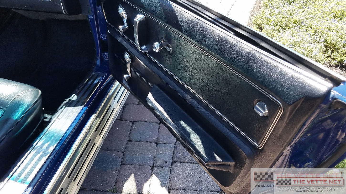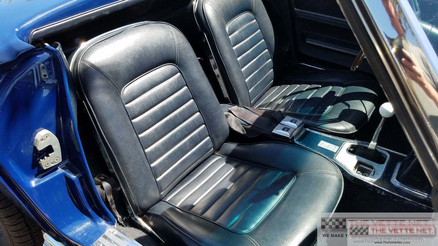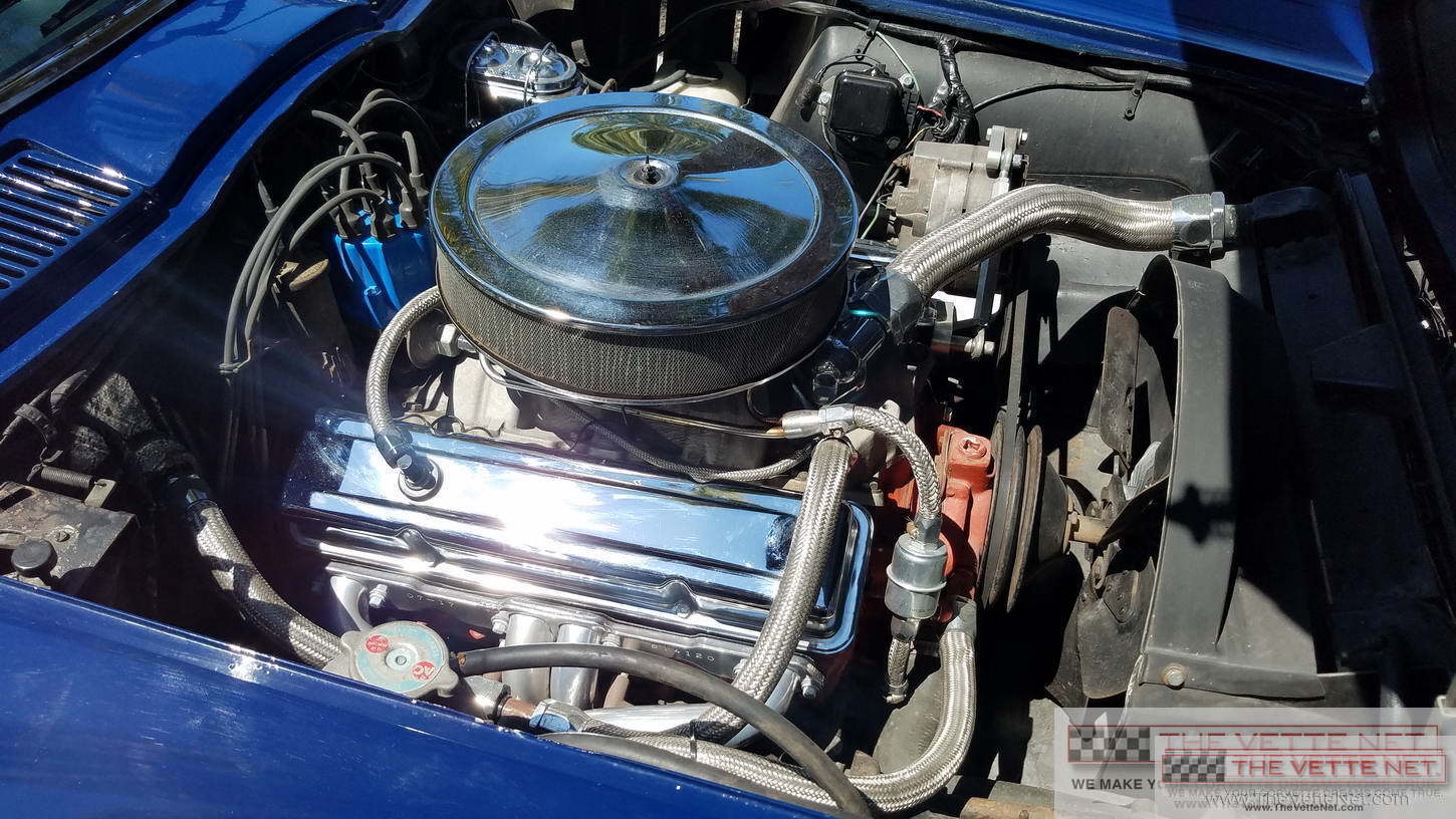 It is powered by a newer GM 350 engine which replaced the factory 327/350 L79 the car came with. There is no information on the HP rating, but it is believed to be around 300 with the help of the high-rise manifold and Flowmaster headers. Transmission is a 4-speed manual which performs flawlessly. Sorry, no power options on this hot rod! Check out the factory correct side pipes! Interior appears also redone recently and is the correct Blue Vinyl, trim code 418. Dash, carpet, door panels… are all correct. All instruments and gauges are functional with the exception of the clock. Undercarriage is clean.