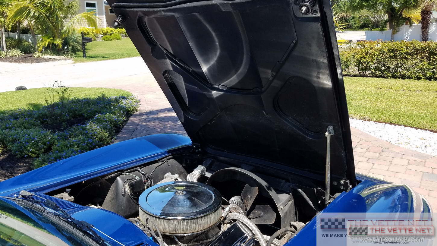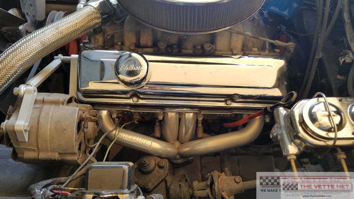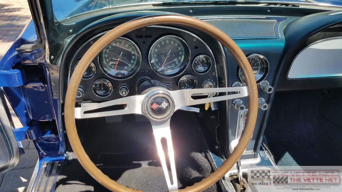 It is powered by a newer GM 350 engine which replaced the factory 327/350 L79 the car came with. There is no information on the HP rating, but it is believed to be around 300 with the help of the high-rise manifold and Flowmaster headers. Transmission is a 4-speed manual which performs flawlessly. Sorry, no power options on this hot rod! Check out the factory correct side pipes! Interior appears also redone recently and is the correct Blue Vinyl, trim code 418. Dash, carpet, door panels… are all correct. All instruments and gauges are functional with the exception of the clock. Undercarriage is clean.