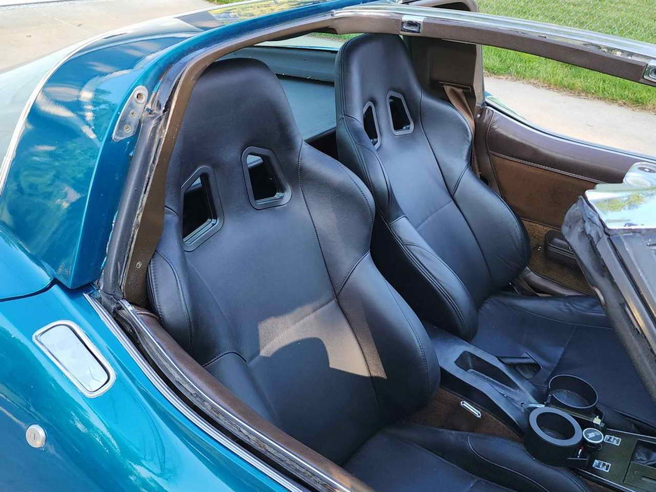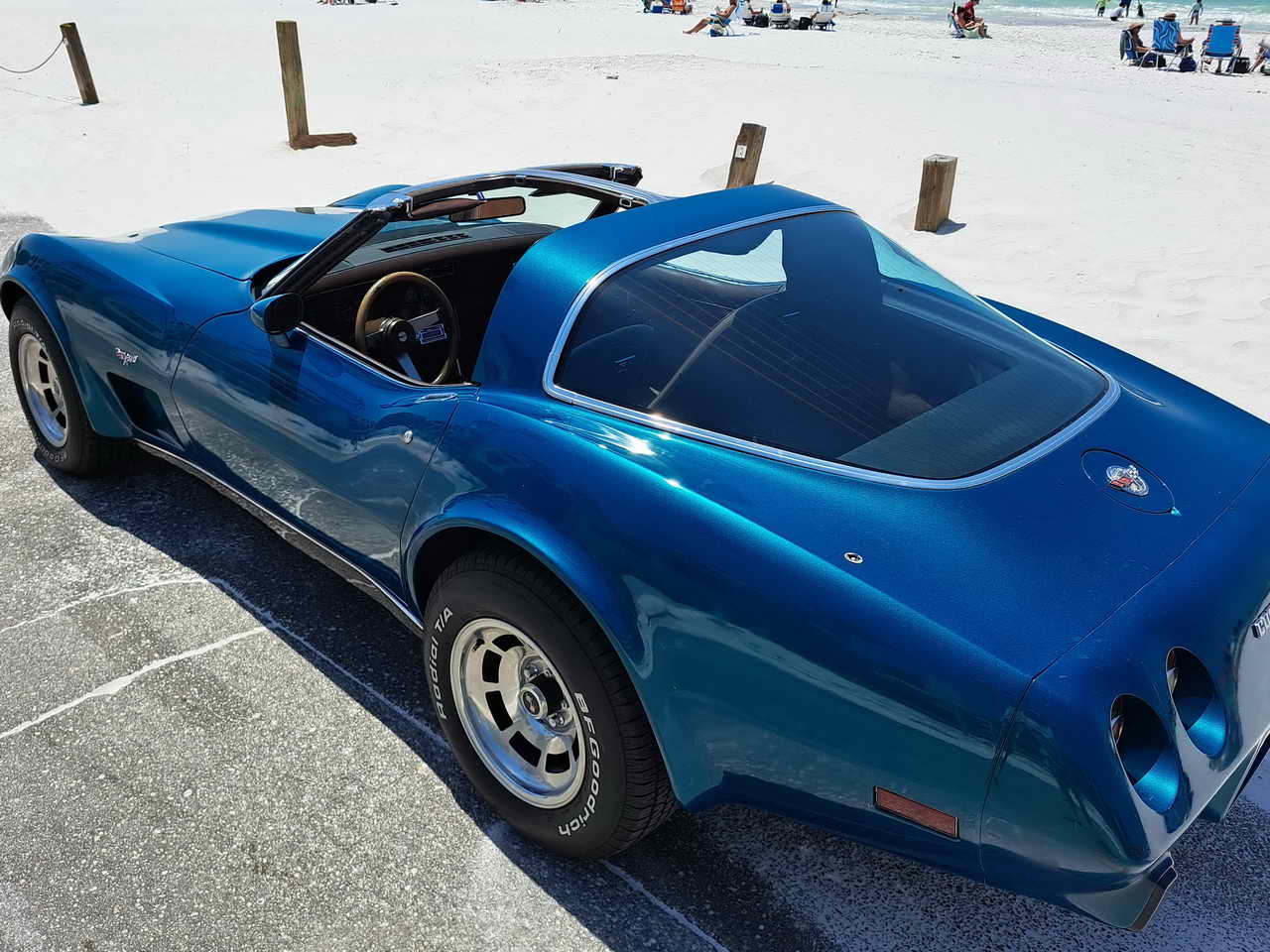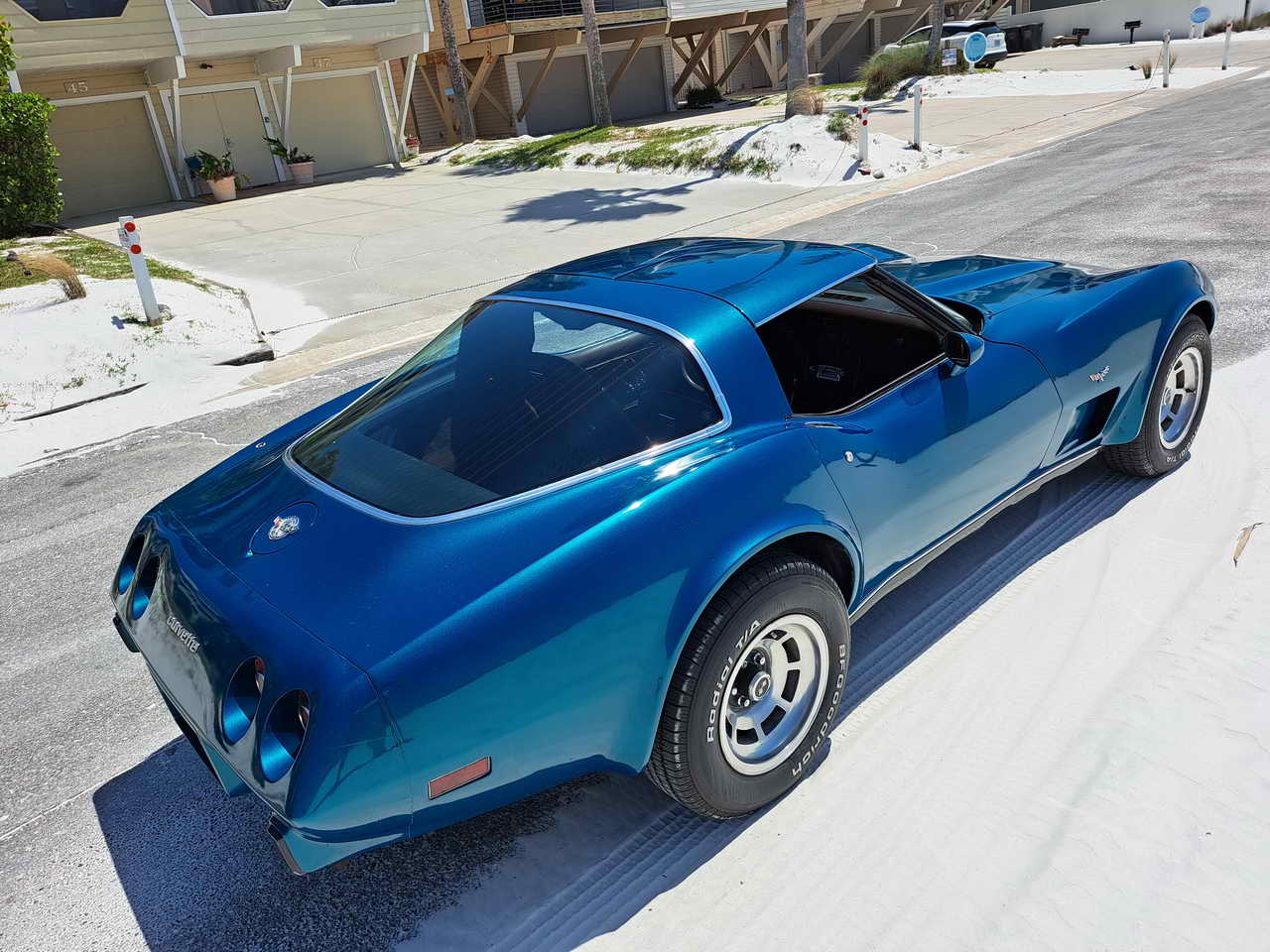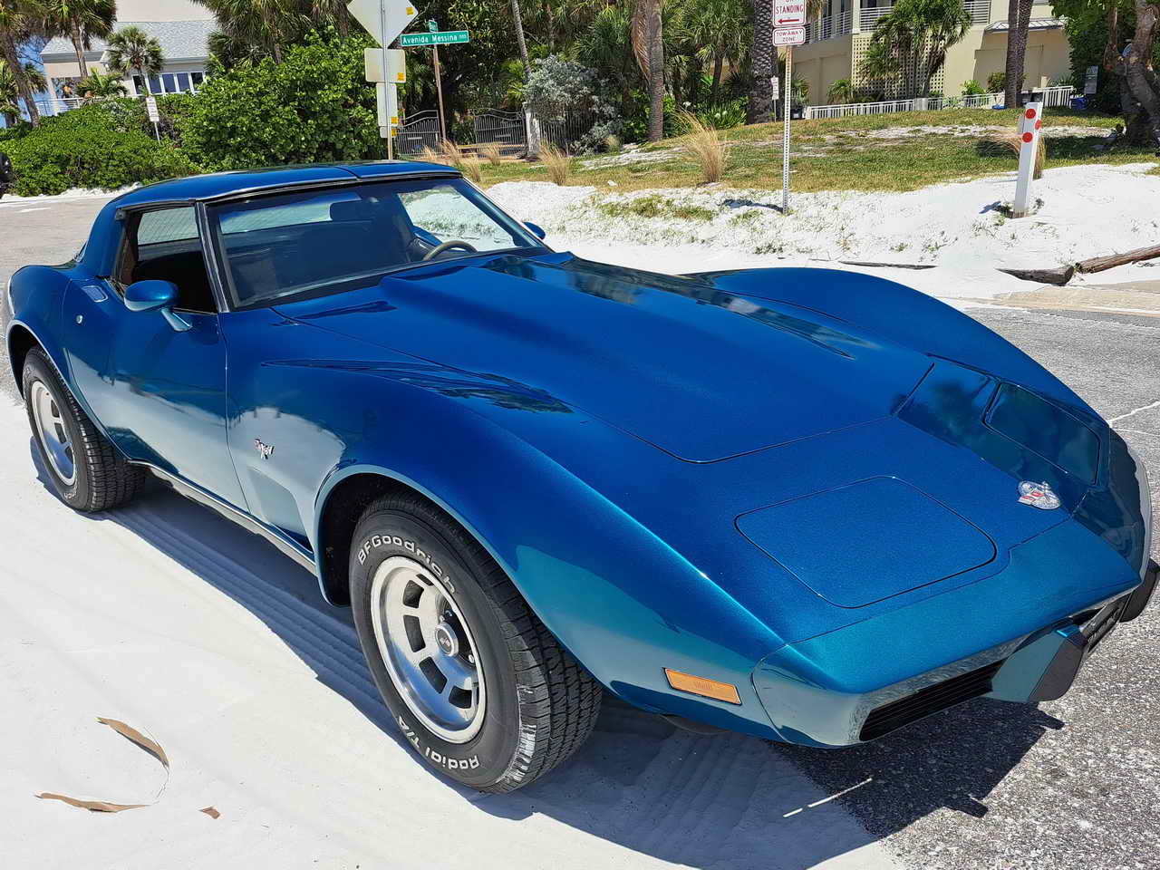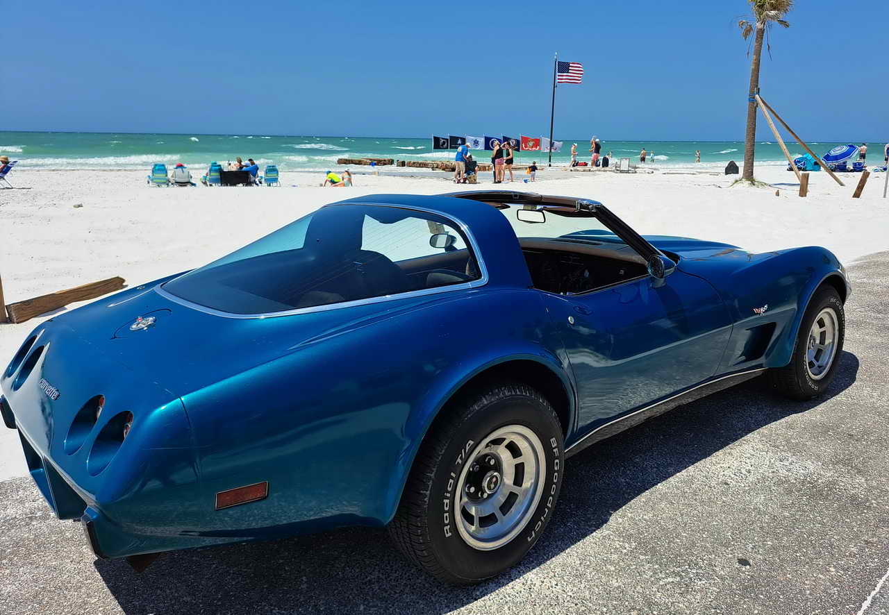 We are pleased to bring to your attention a fine example of late C3s, a beautiful T-Top Coupe dressed in a chameleonic custom color, Blue with Green hues, almost a Teal, depending on how the light hits it. Paint looks great, it is not perfect, though, showing imperfections here and there as seen in the pics. However, with a recently applied ceramic coating it has a very nice and deep shine.