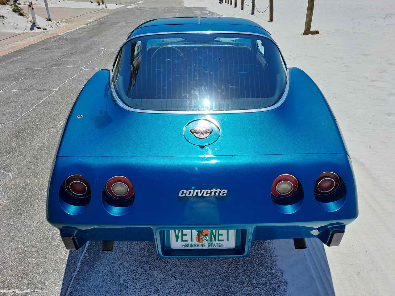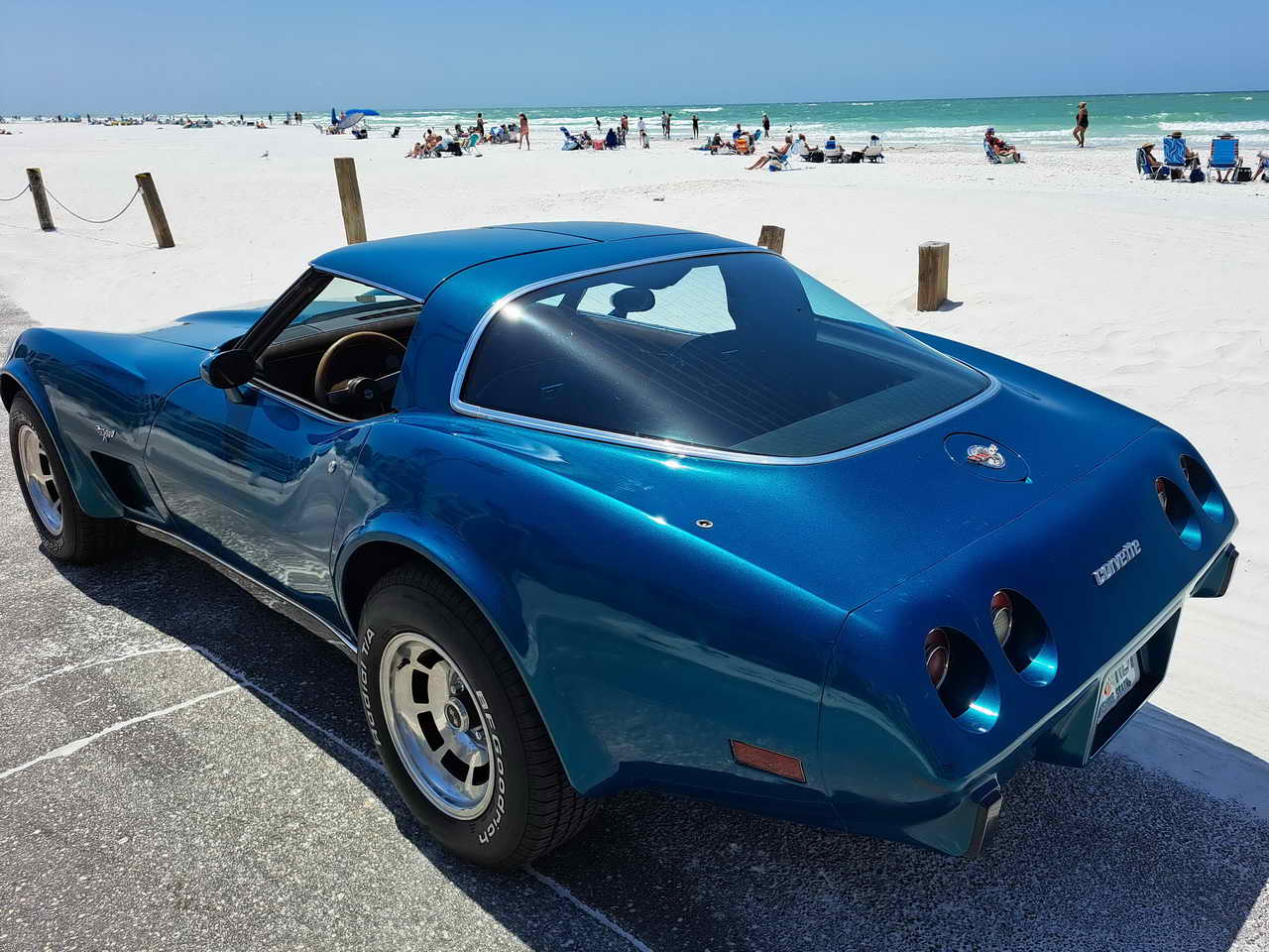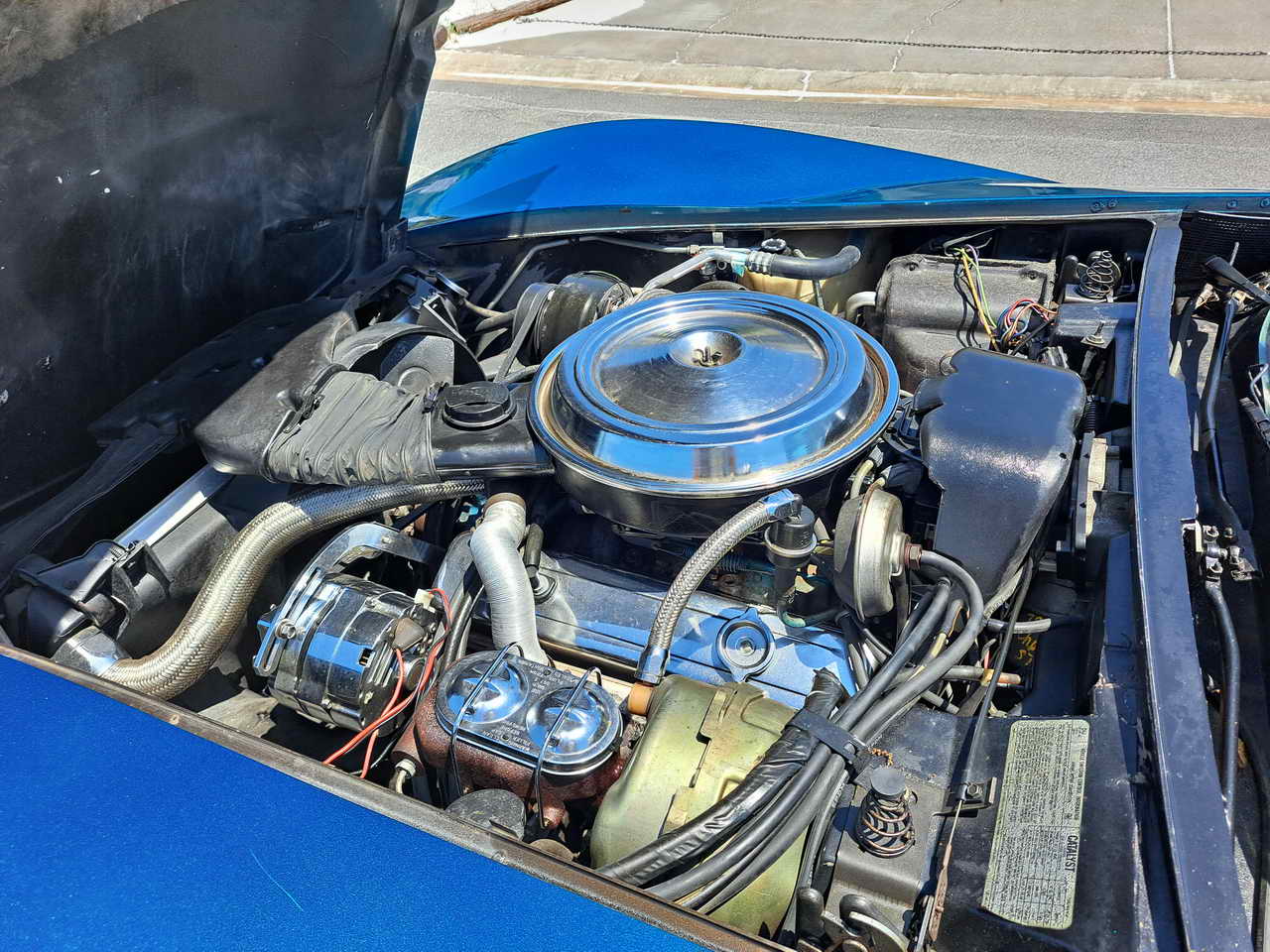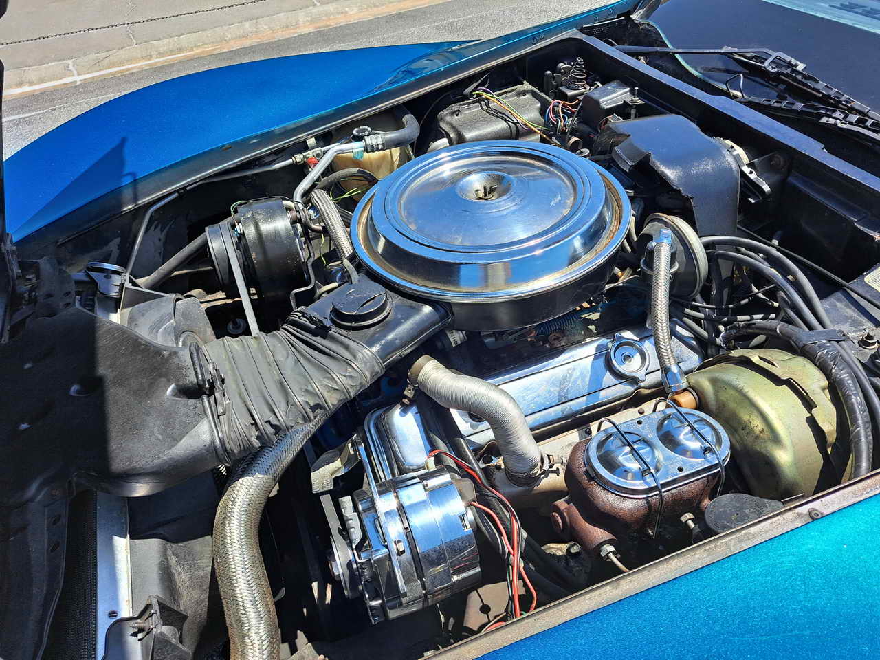 We are pleased to bring to your attention a fine example of late C3s, a beautiful T-Top Coupe dressed in a chameleonic custom color, Blue with Green hues, almost a Teal, depending on how the light hits it. Paint looks great, it is not perfect, though, showing imperfections here and there as seen in the pics. However, with a recently applied ceramic coating it has a very nice and deep shine.