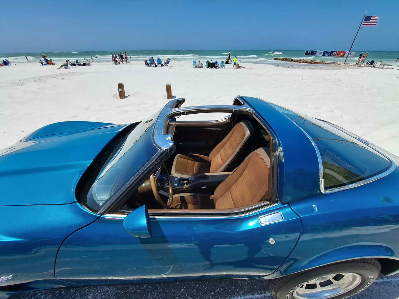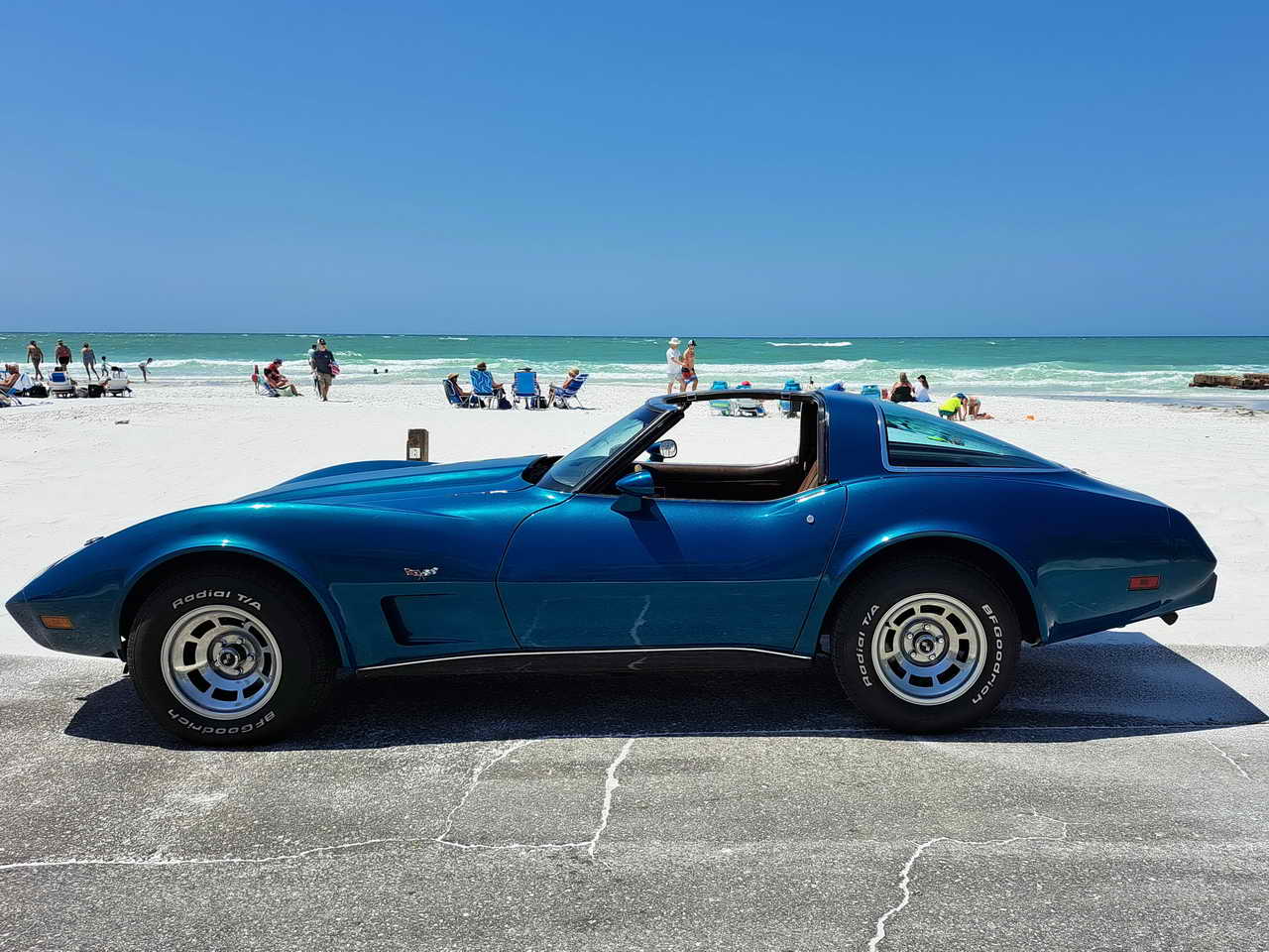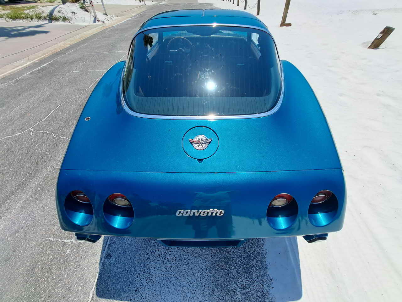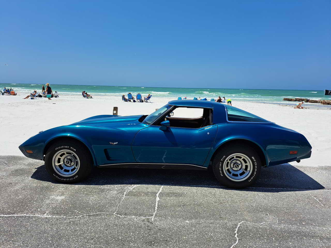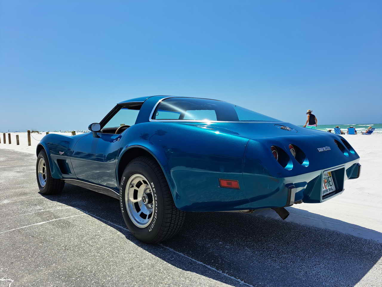 We are pleased to bring to your attention a fine example of late C3s, a beautiful T-Top Coupe dressed in a chameleonic custom color, Blue with Green hues, almost a Teal, depending on how the light hits it. Paint looks great, it is not perfect, though, showing imperfections here and there as seen in the pics. However, with a recently applied ceramic coating it has a very nice and deep shine.