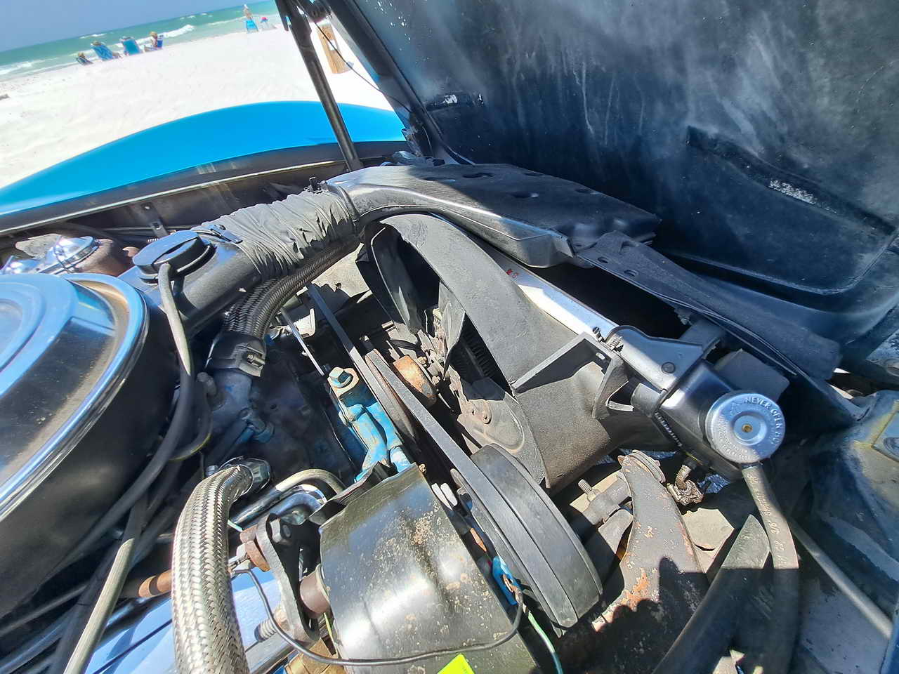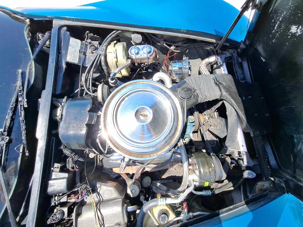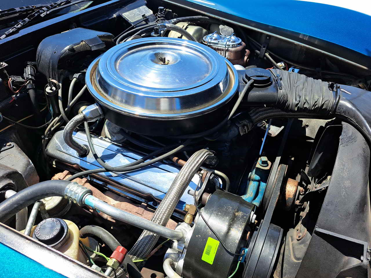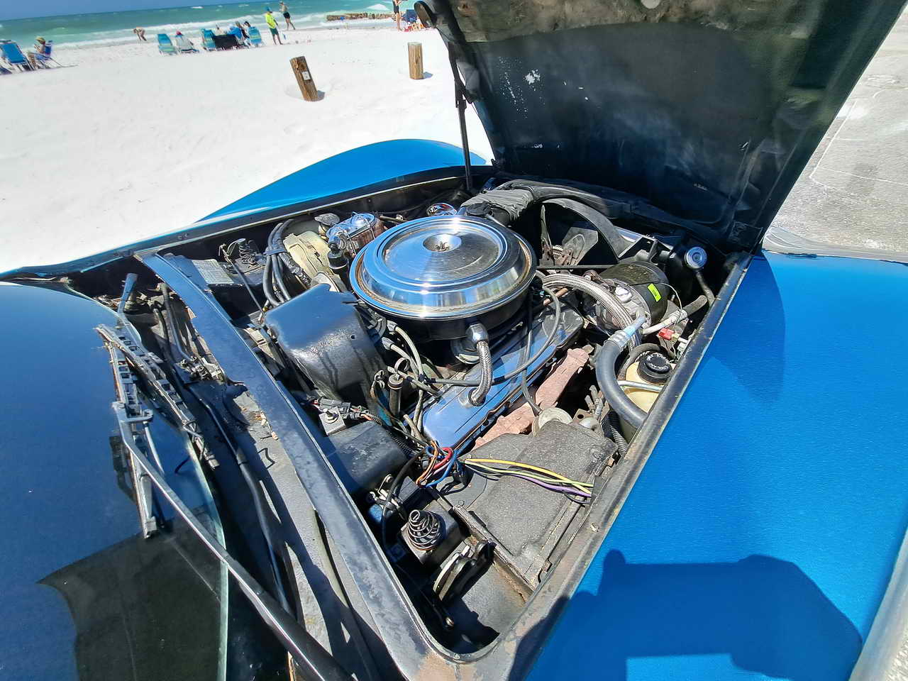 Under the hood sits the standard matching numbers L48 engine which was recently tuned and performs flawlessly. It benefited from the addition of some Chrome parts, like new alternator, engine covers, air intake lid lending it a mild custom look. Complete AC system was installed: compressor, evaporator, radiator, piping which is performing great. Cooling system was upgraded with an aluminum radiator which has no problem keeping it at 185-190 degrees with the AC on when running around in Florida hot Summer. A new power steering pump and steering control module were installed. Engine is mated with the Automatic transmission in excellent functioning order. Vacuum operated headlights work perfectly, all the lights are functional too.